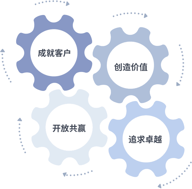 成就客户是一切决策的出发点,,,,创造价值是衡量所有工作的标准,,,,追求卓越是我们做事做人的态度,,,开放共赢是我们的格局也是最终的结果。。价值观的齿轮环环相扣,,,,推动着组织里的每个人不断向前。。。