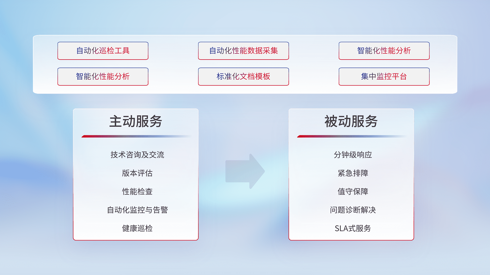 智能化工具和标准化文档,,,保障服务质量,,提供主动服务(包含技术咨询、、、版本评估、、、性能检查、、、自动化监控与告警、、健康巡检)和被动服务包含(分钟级响应、、、、紧急排障、、、值守保障、、、、问题诊断解决、、、SLA服务)。。。